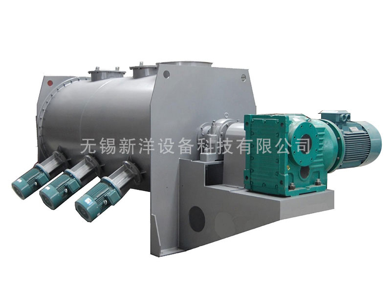 該機型由傳動機構(gòu)、臥式筒體、犁刀、飛刀四部分組成。物料在犁刀作用下沿筒壁作對流運動,當(dāng)物料流經(jīng)飛刀時被高速旋轉(zhuǎn)的飛刀拋灑,從而在較短時間內(nèi)達到均勻混合。能滿足大多固液混合以及造濕粒、干燥等復(fù)合工藝。
