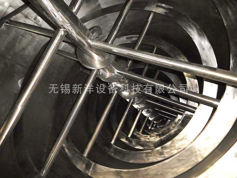 設備設有多種樣式(刮板、內螺旋、外螺帶),也可以雙錐體結構,適應不同物料,適應較高粘度的流體物料混合。螺帶式混合機,它是攪拌粘性流體或稠狀、濕狀、膏狀為主,也可以混合粉體。