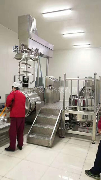 物料在水鍋、油鍋內(nèi)通過加熱、攪拌進行混合反應后,由真空泵吸入乳化鍋,通過乳化鍋內(nèi)上部的中心攪拌、聚四氟乙烯刮板始終迎合攪拌鍋形體,掃凈掛壁粘料,使被刮取的物料不斷產(chǎn)生新界面,再經(jīng)過葉片的剪斷、壓縮、折疊,使其攪拌、混合而向下流往鍋體下方的均質(zhì)器處,物料再通過高速旋轉(zhuǎn)的切割輪與固定的切割套之間所產(chǎn)生的強力的剪斷、沖擊、亂流等過程,物料在剪切縫中被切割,迅速破碎成200um-0.2um的微粒,由于乳化鍋內(nèi)處于真空狀態(tài),物料在攪拌過程中產(chǎn)生的氣泡被及時抽走。采用抽真空的方式,使所生產(chǎn)的制品在攪拌過程中不再混入氣泡,從而保證可制造出富有光澤、細膩及延展性良好的產(chǎn)品。